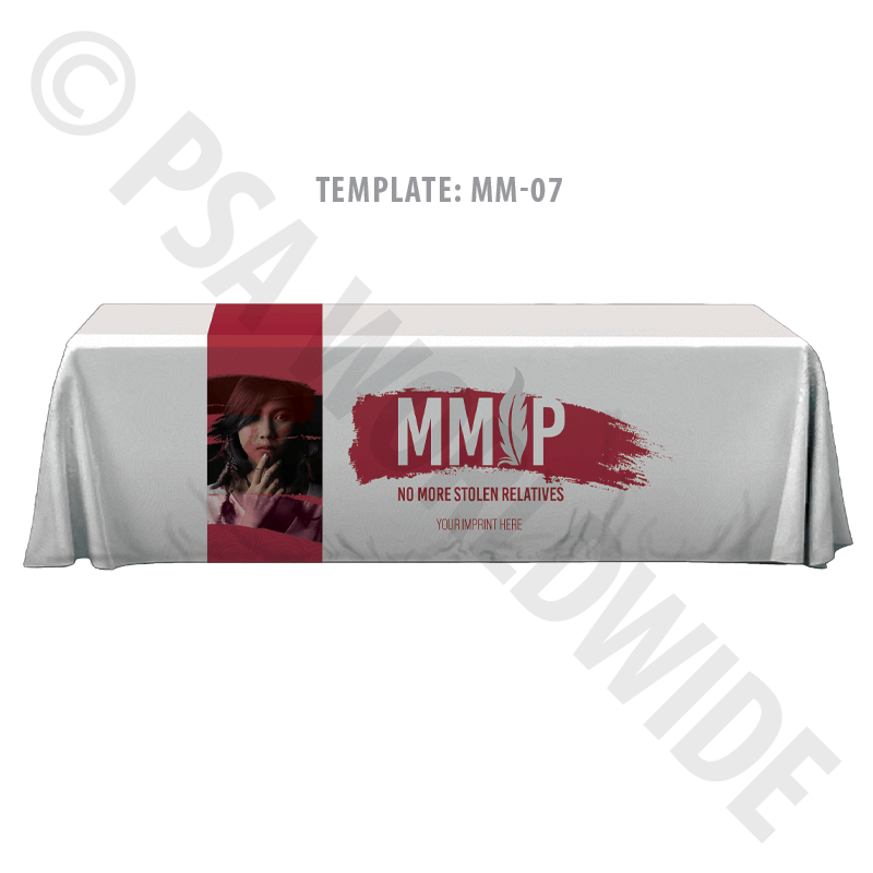 It's a big dilemma when choosing a table throw for events… which size do you purchase? The answer is this adjustable throw with convenient Velcro tabs to accommodate six or eight foot table lengths. These throws are exclusively designed for spreading awareness on Missing and Murdered Indigenous Persons in Native communities. Fabric is dyed to your custom color, with your full-color imprint.