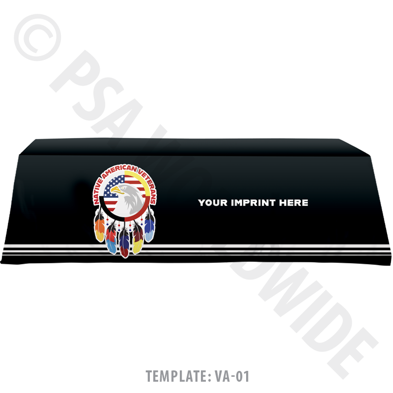 It's a big dilemma when choosing a table throw for events… which size do you purchase? The answer is this adjustable throw with convenient Velcro tabs to accommodate six or eight foot table lengths. These throws are exclusively designed for Native communities. Fabric is dyed to your custom color, with your full-color imprint.